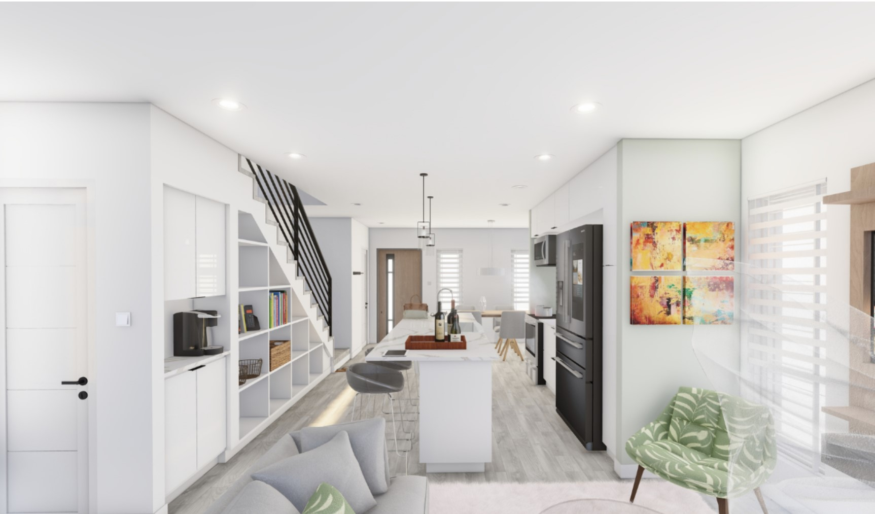 - Open-concept living, dining, and kitchen area
